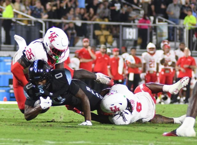 After giving up 24 first-half points, including 21 in the second period alone, the Houston defense swarmed UCF in the second half and rallied for a 30-27 victory. Photo by Debra Edgar